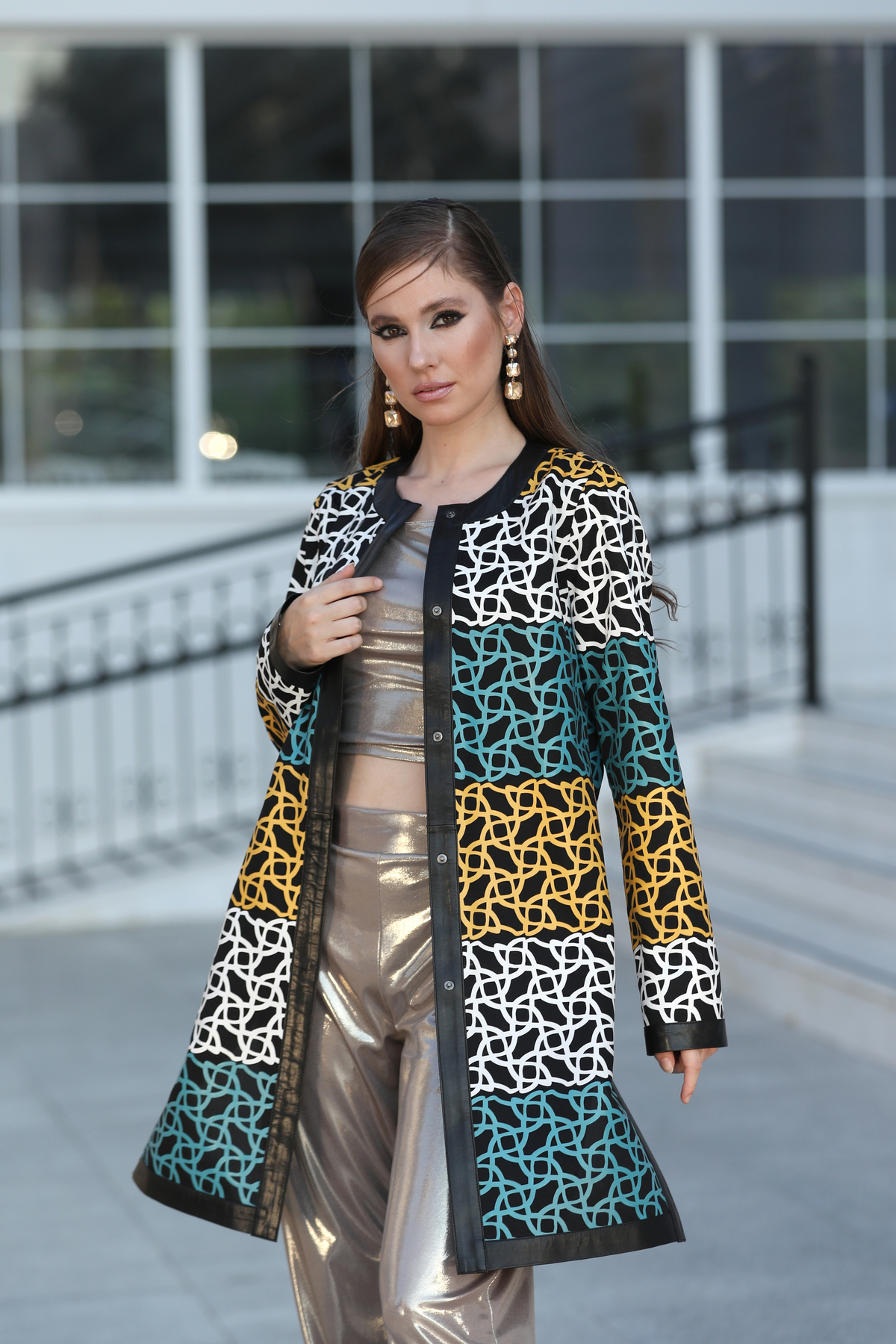 Confeccionada en piel de cordero, cuyo cuero principal es 100% CUERO GENUINO, esta chaqueta llama la atención por sus finos detalles de tul y su fino tejido de punto de tul negro. El cuero, al que se le da forma precisa mediante corte láser, ofrece una experiencia de uso ligera y cómoda con un grosor de cuero de 0,2 mm.